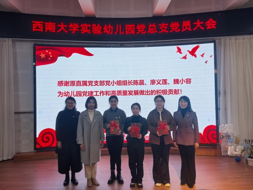 大会还为原幼儿园直属党支部党小组组长陈晨、廖义莲、魏小容颁发了工作纪念册,感谢她们过去为幼儿园党建工作和各项事业发展作出的积极贡献。